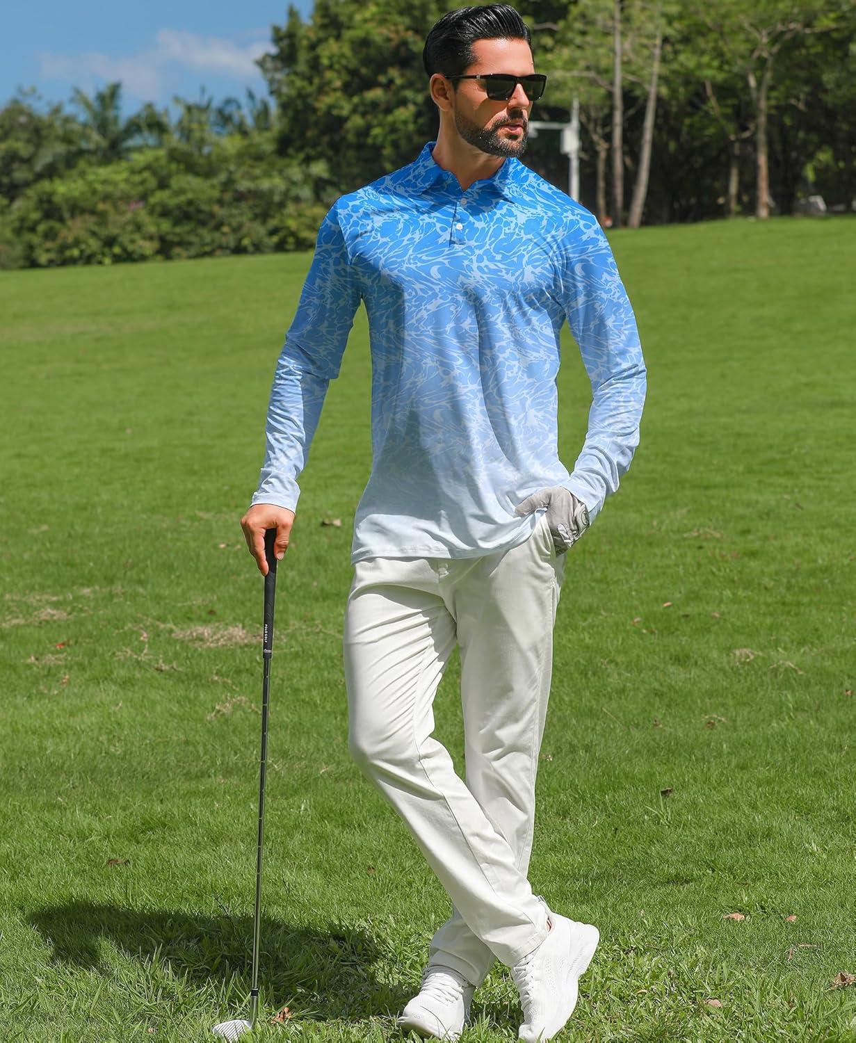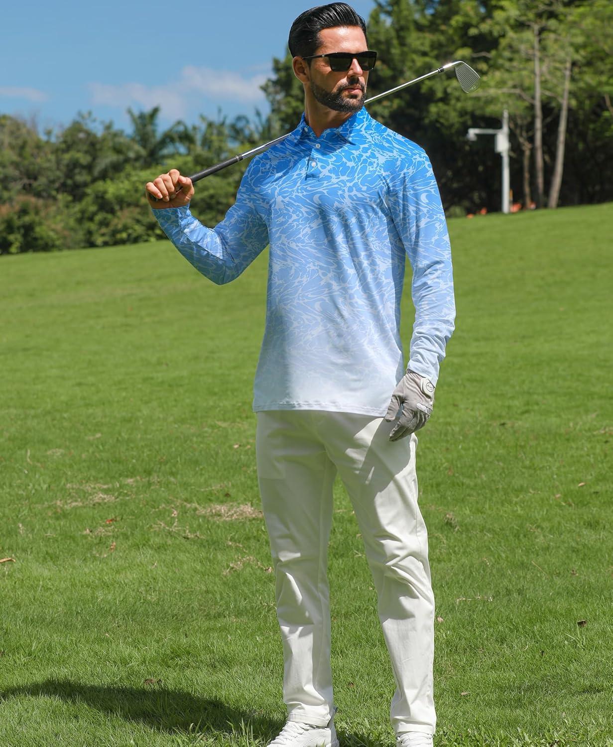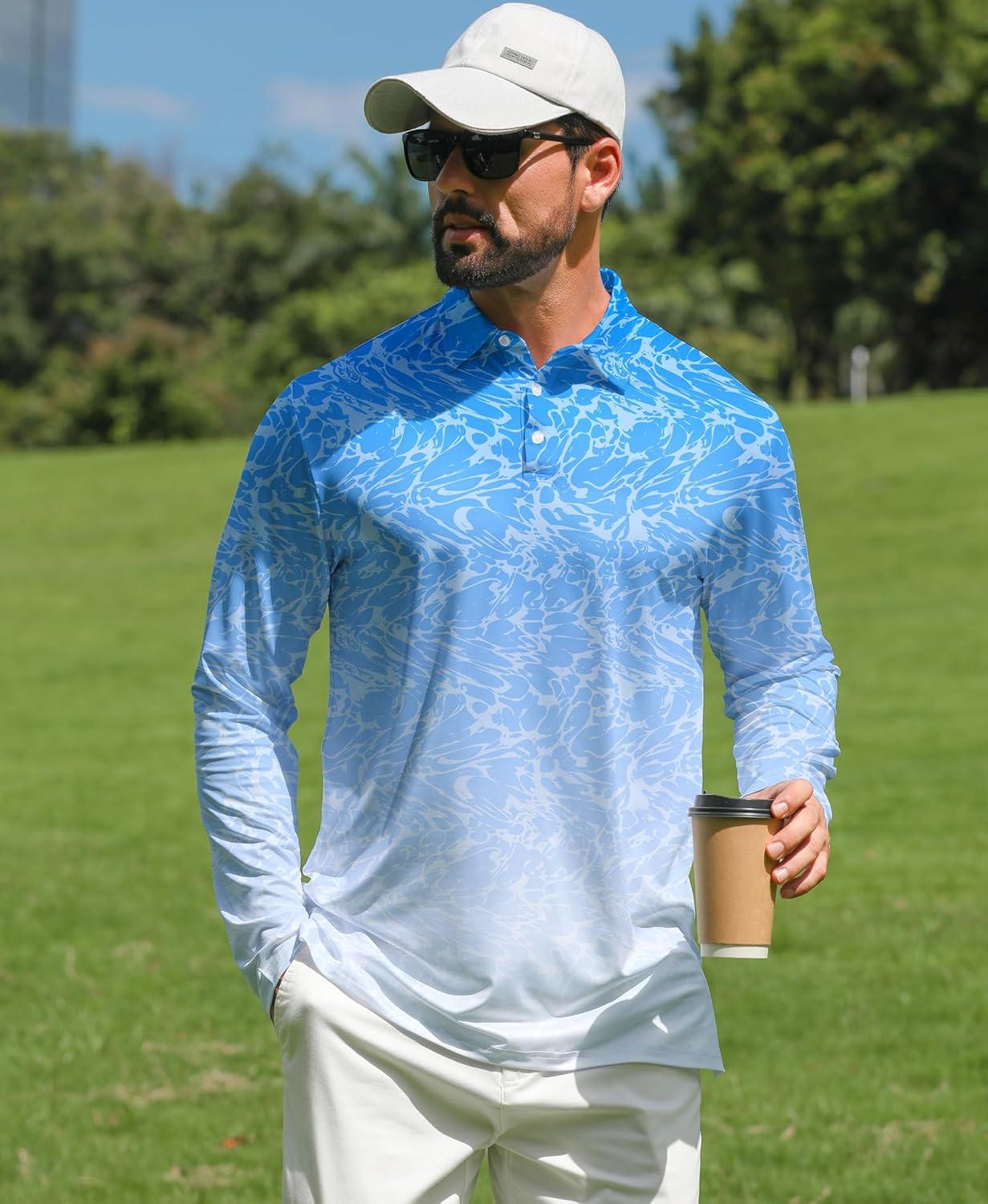 ELETOP Mens Golf Shirts Long Sleeve Print Performance Polo Shirts Moisture Wicking Dry Fit Golf Polo for Men(146 Water Ripple Blue)