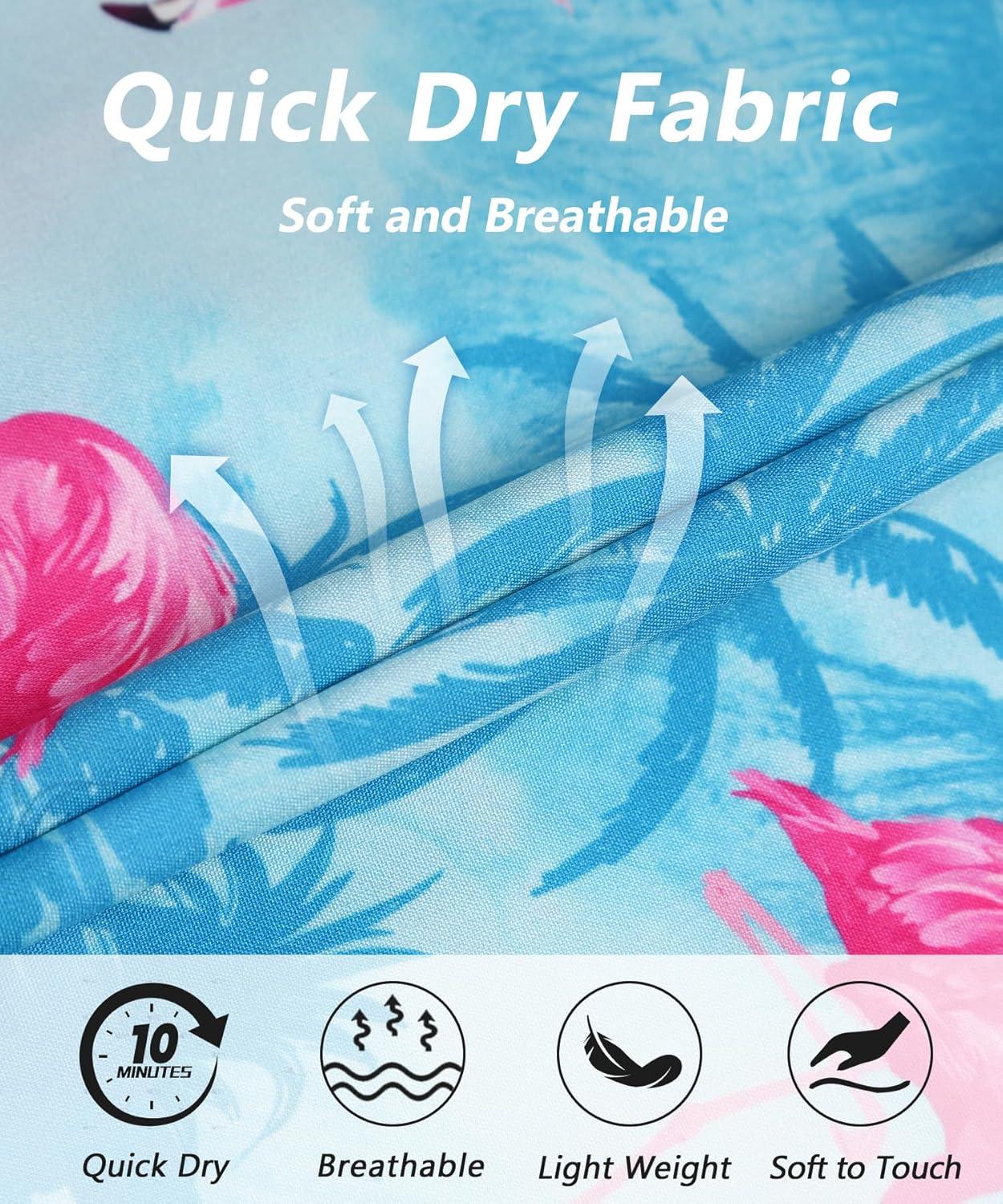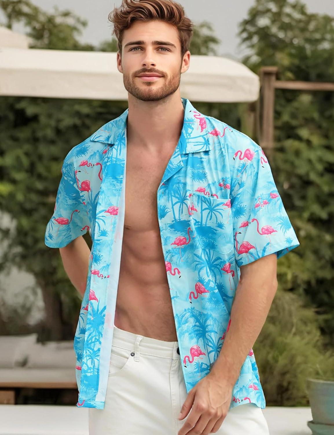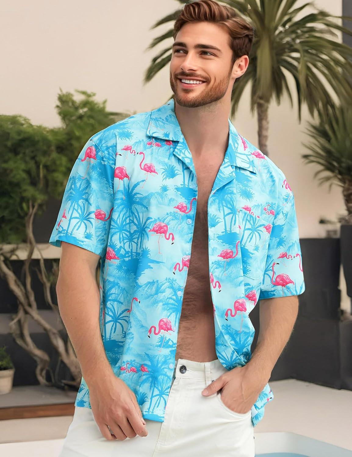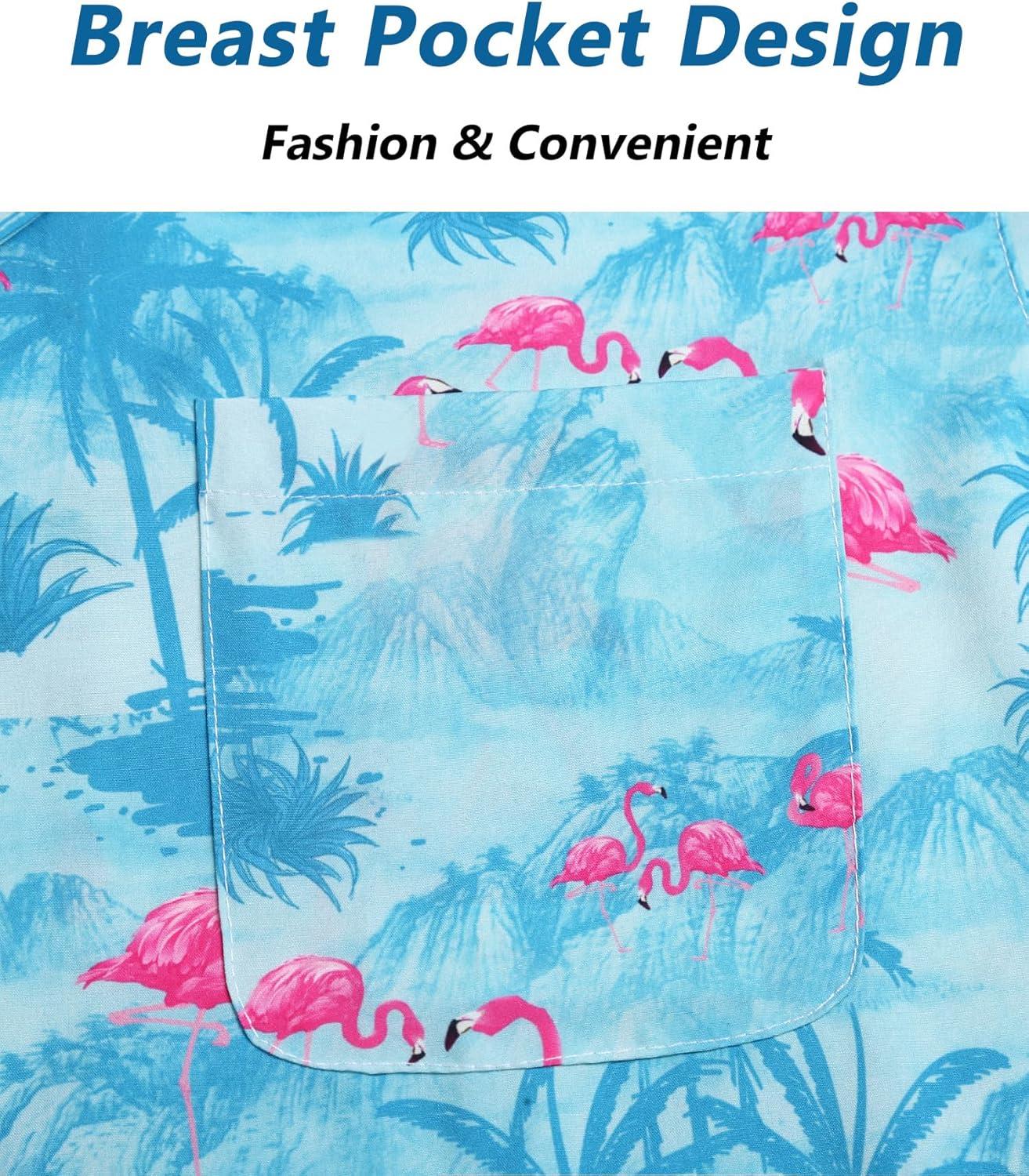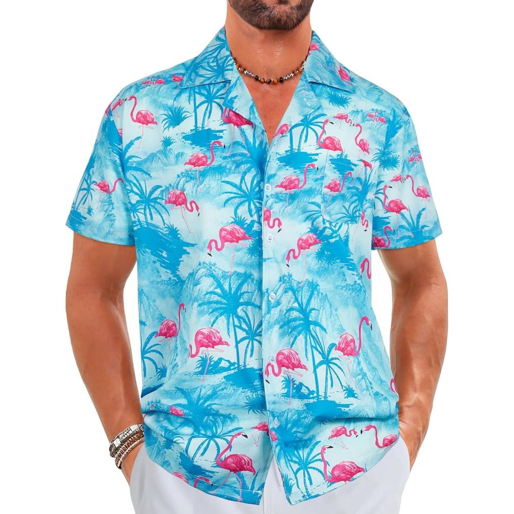 ELETOP Men’s Hawaiian Shirt Short Sleeve Button Down Casual Tropical Aloha Beach Shirts(034 Flamingo Light Blue)
