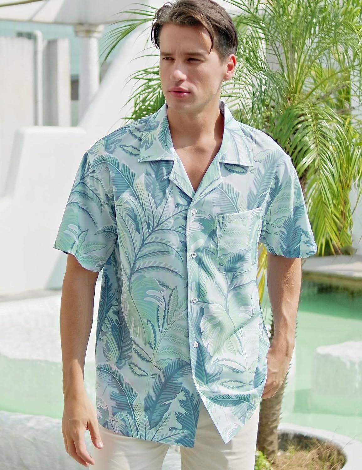 ELETOP Men's Hawaiian Shirt Short Sleeve Button Down Casual Tropical Aloha Beach Shirts(132 Palm Grey Blue)