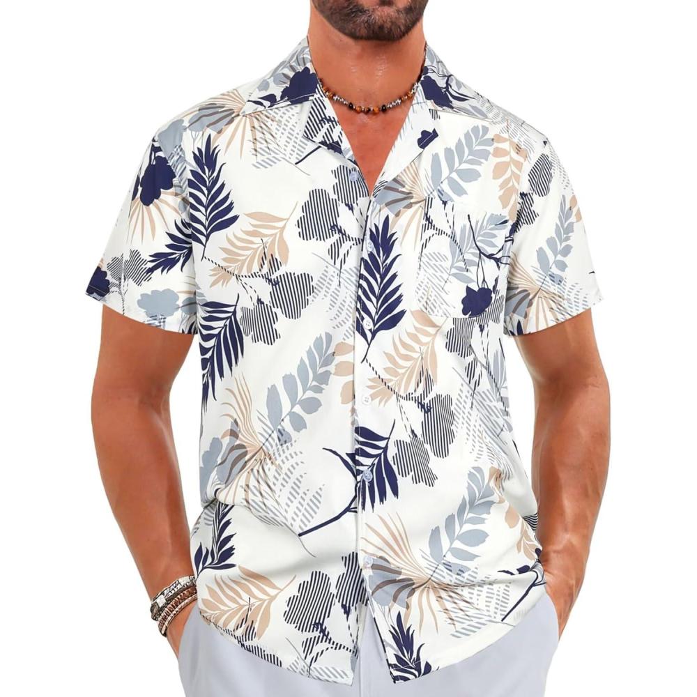 imageELETOP Mens Hawaiian Shirt Short Sleeve Button Down Casual Tropical Aloha Beach Shirts206 Leaf Blue White