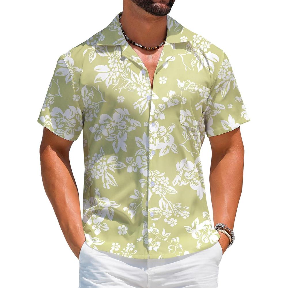 imageELETOP Mens Hawaiian Shirt Short Sleeve Button Down Casual Tropical Aloha Beach Shirts258 Light Green White Flower