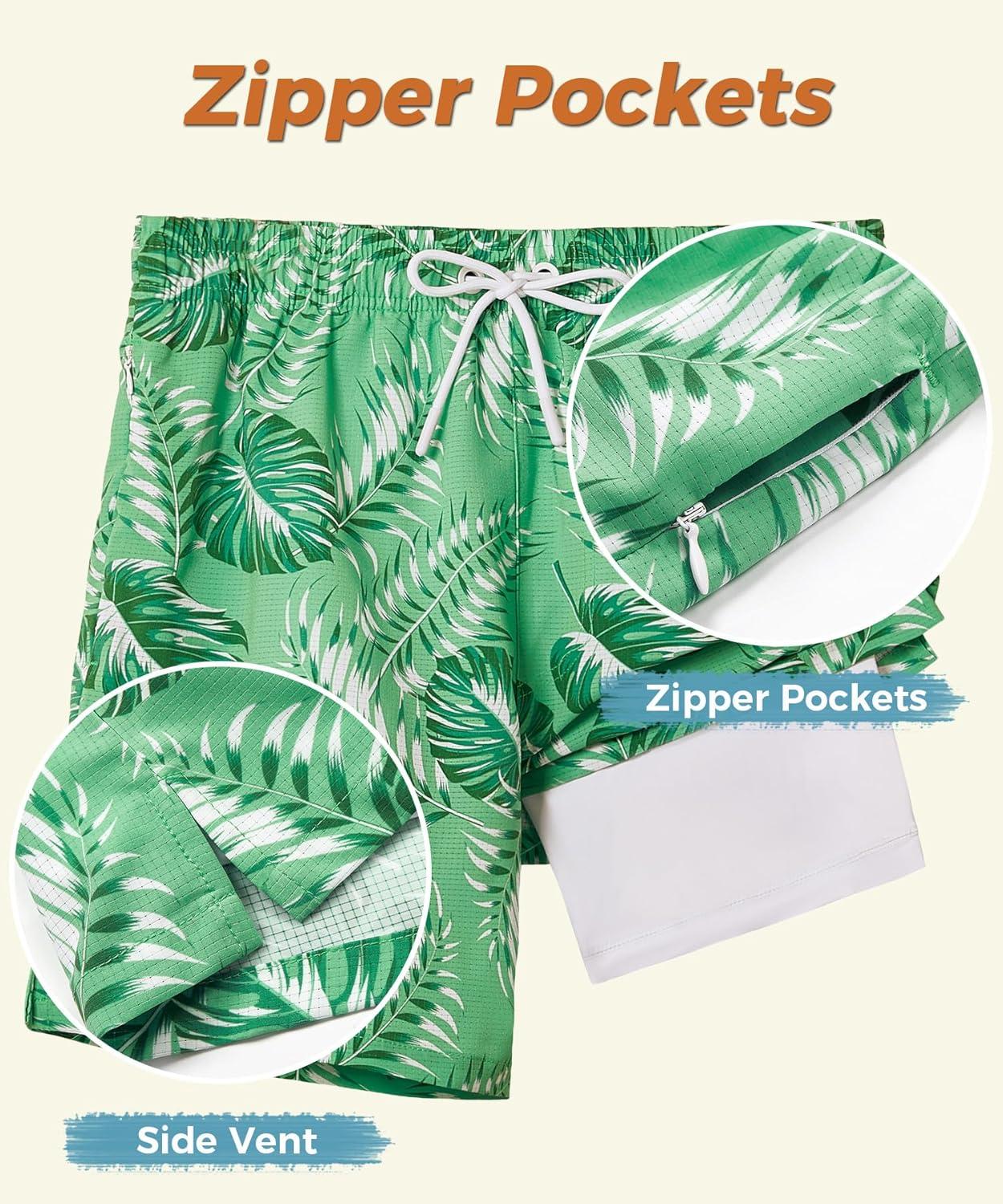 ELETOP Men's Swim Trunks with Compression Liner Bathing Suit Beach Board Shorts with Zipper Pockets(618 Palm Leaf Green)
